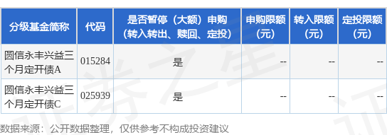 注:本基金暂停申购、转换转入业务只针对个人投资者。圆信永丰兴益三个月定开债A类基金份额自2022年12月17日起,暂停个人投资者的申购、转换转入业务。自2025年10月30日起,本基金增设C类基金份额。圆信永丰兴益三个月定开债C类基金份额自2025年10月30日起暂停个人投资者的申购、转换转入业务。